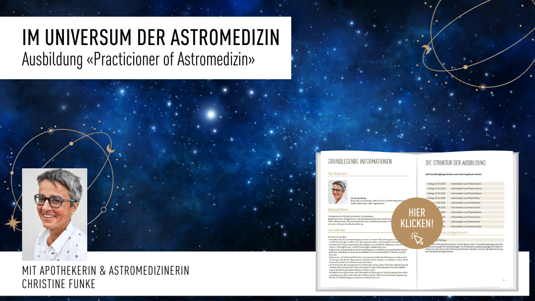 Unsere Ausbildung «Practitioner of Astromedizin» mit Apothekerin und Astromedizinerin Christine Funke verbindet das Wissen über planetarische Energien mit den heilenden Kräften der Arzneipflanzen. In zehn praxisnahen Modulen lernen Sie, wie die energetischen Urprinzipien der Planeten – von Saturn bis Jupiter – durch Heilpflanzen auf Körper, Geist und Seele wirken. Diese einzigartige Ausbildung bietet Fachpersonen mit medizinischem Grundwissen die Möglichkeit, ganzheitliche Therapien zu entwickeln und anzuwenden. Entdecken Sie die neuen therapeutischen Möglichkeiten, die die Kombination aus intuitivem Erleben und wissenschaftlicher Erkenntnis eröffnet. Lassen Sie sich inspirieren und starten Sie Ihre Reise in die Astromedizin. Möchten Sie mehr erfahren? Hier geht's zur Anmeldung >>