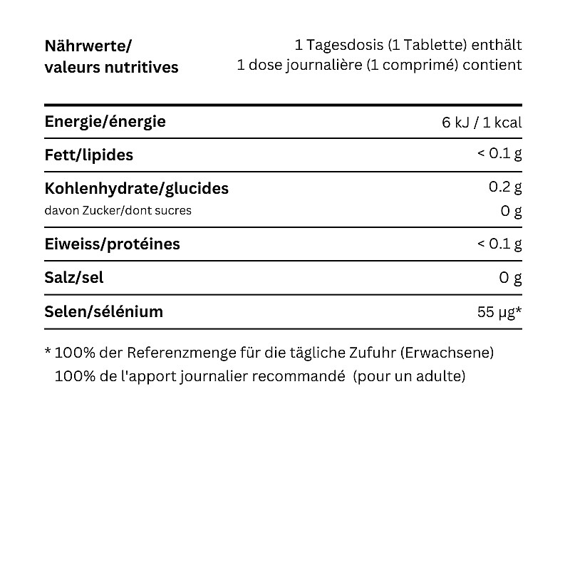 Laktose, Bierhefepulver (glutenhaltig) 29 %, Selenhefepulver (Hefe kultiviert in selenhaltigem Nährmedium) 14 %, Stärke, Trennmittel (Magnesiumstearat)